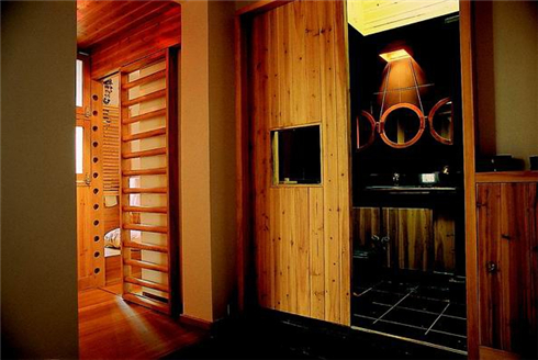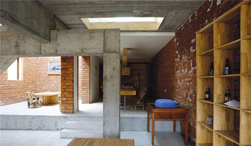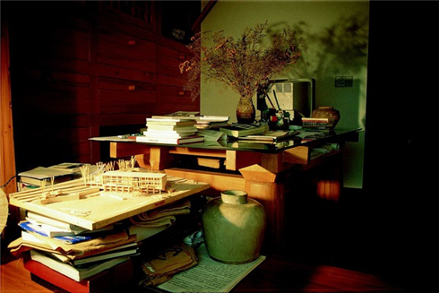 王澍覺(jué)得過(guò)多的書(shū)擺在敞開(kāi)的書(shū)架上讓人厭煩,他受不了這個(gè)壓抑,要它們在視線(xiàn)中消失,他設計了一個(gè)帶門(mén)的書(shū)架,敦實(shí)的木結構讓它看起來(lái)更像一個(gè)完整的建筑,而非家居的附屬品。書(shū)房中的木桌碩大無(wú)朋,完全參照宋代《營(yíng)造法式》而做,1 .1米X 2.2 米的桌面是一塊透明的大玻璃,可以直接俯瞰到敦實(shí)的桌腿本身,使其變成了一個(gè)縮小版的房屋。整個(gè)房子里,王澍只放置了一把椅子,一個(gè)同樣造型仿古,結構方正的大椅子,緊貼著(zhù)墻面,又變成了一個(gè)可以坐的建筑。