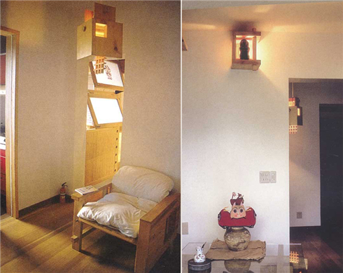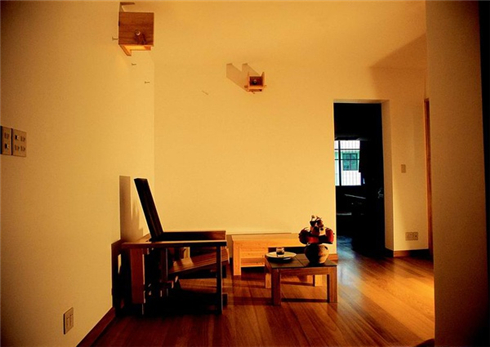 八盞燈都是實(shí)木質(zhì)地,外表方正,各有參差不同,這些微型的建筑有自己的屋檐、墻壁,獨柱廊、天窗……八盞燈是一個(gè)建筑的小品,散布在住宅中,構成了一個(gè)獨特的系統。是“八間不能居住的房子”。木工師傅被折磨得頭昏腦脹,等到燈被固定在墻上,里面接通一只普通的白熾燈泡時(shí),魔幻般的光鮮把所有的工匠驚得啞口無(wú)言。王澍內心很得意,當工程結束之后,只需時(shí)不時(shí)地變化燈具的外套,他就永遠有事可做。