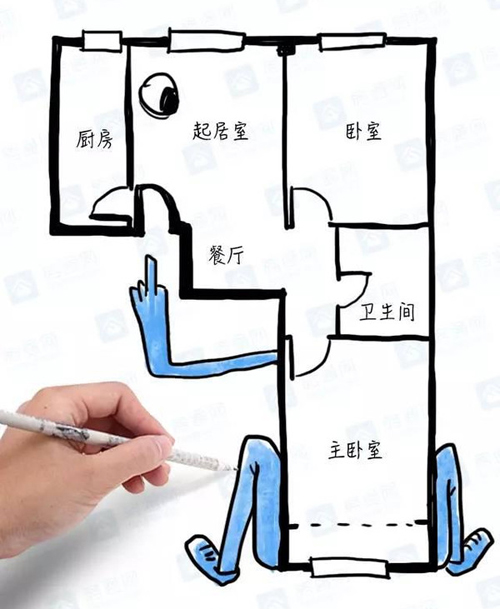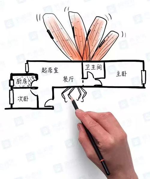 乍一看是個(gè)不錯的戶(hù)型,但是仔細分析,這不是倒把呼吸嘛?風(fēng)水不好啊。另外,南北進(jìn)深長(cháng)也是個(gè)問(wèn)題。