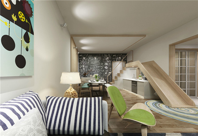 以明快的風(fēng)格為音符,跳躍于充滿(mǎn)逗趣的空間里,是這里最為顯著(zhù)的特點(diǎn)。夫婦倆童心未泯,因此設計師加入滑梯,讓他們拾回孩提的純真。而由于現有廚房太小,H小姐又熱愛(ài)烘焙及西餐,因此傳家設計師在滑梯下方增設了獨立西廚,在每一個(gè)普通又珍貴的日子里,她將在這里為先生烹飪一道道舌尖上的珍饈。
