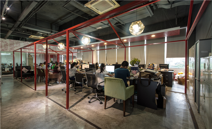 傳家裝飾運用屋檐的立面造型劃分出辦公區,鋼筋和透明玻璃、烤漆辦公桌的有機對比和搭配,形成具有視覺(jué)沖擊力的辦公空間。