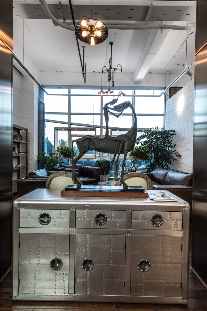 會(huì )客空間與交流空間用鐵馬雕塑隔開(kāi),這匹鐵馬名叫“自度”,廣州美院學(xué)生畢業(yè)作品,是整個(gè)空間的點(diǎn)睛之筆。綠色的盆栽點(diǎn)綴其中,沒(méi)有多余的刻意擺設,但是空間的每一樣物品都用它的材質(zhì),味道以及顏色營(yíng)造簡(jiǎn)約隨意氛圍。