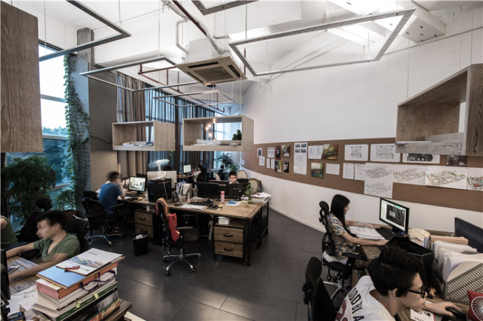 辦公區域延續了整體風(fēng)格,高聳的天花板令空間顯得極其開(kāi)闊,貼滿(mǎn)了設計圖的墻面是工作成果,也是空間的裝飾品。小植物、小擺設使得大環(huán)境自有悠然小天地。