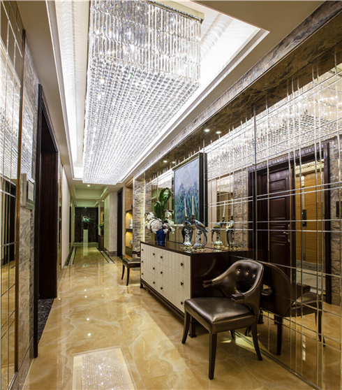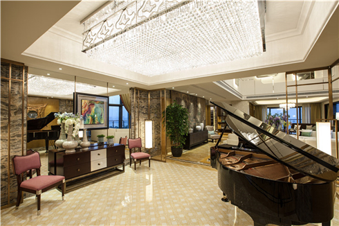 整個(gè)公共區域的燈飾以水晶吊燈為主,乍一看是浮華,但如果你將陽(yáng)臺的門(mén)輕輕打開(kāi),會(huì )聽(tīng)到燈穗因相互撞擊而發(fā)出的聲音,這是對大海的一種回應。