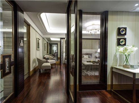 客廳原有的仿復式挑高設計十分應景,頂端鍍以銀箔,上半部分采用不銹鋼材料撥亮高層空間,下半部分墻體嵌以玻璃絹畫(huà),繪影繪神。墻壁上的肌理漆與墻角的大理石,實(shí)木地腳線(xiàn)的工藝,映襯出空間的華美。