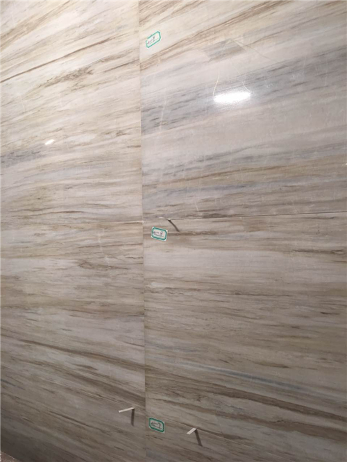 主臥衛生間的墻面大理石是從傳家石材廠(chǎng)一大整板切割后,根據紋理標上序號,到施工現場(chǎng)拼接而成。