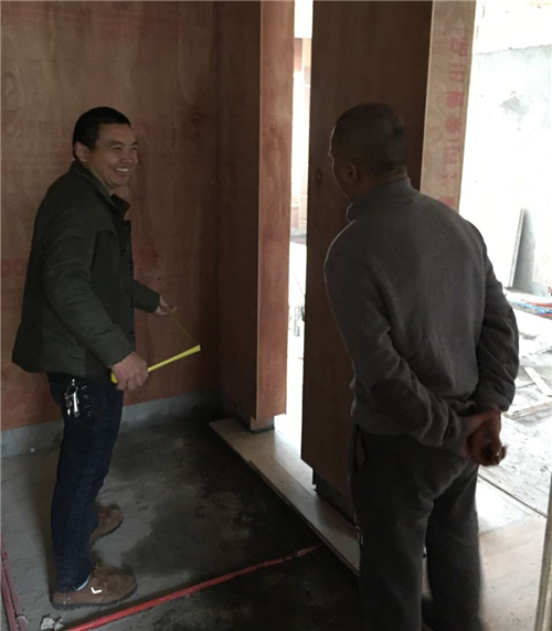 傳家裝飾工程經(jīng)理張國友和主案設計師劉偉在施工現場(chǎng)
