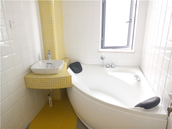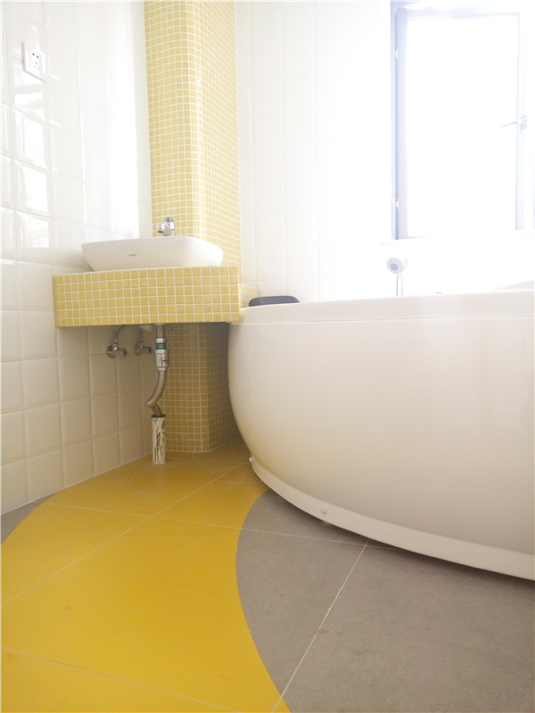 盥洗臺的凹邊與浴缸的圓弧互補,專(zhuān)門(mén)定做的地板延伸了墻面與盥洗臺的明黃,灑落的弧線(xiàn)又與浴缸相映稱(chēng)。