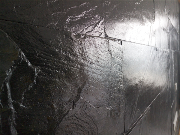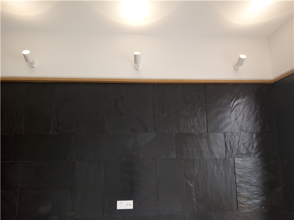 經(jīng)過(guò)細心打磨與清漆處理的石材電視背景墻,黛墨深邃,紋路自然。