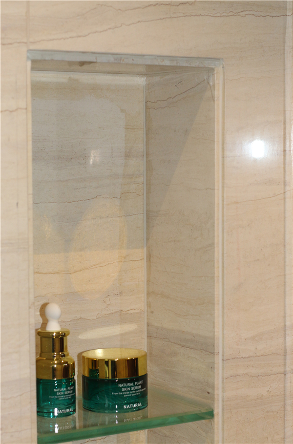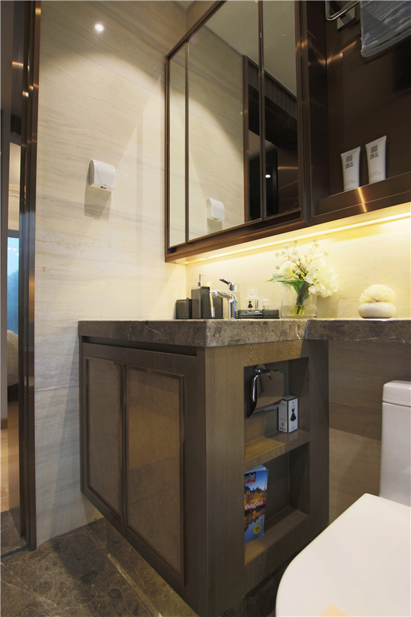 浴室里的置物架被設計成嵌入式,恰到好處的尺寸把控以及每一塊瓷磚的研磨拼接都在師傅們一番強烈討論后得以最終呈現,特別定制的側面帶有嵌入式置物架的木質(zhì)盥洗臺也是費了一番周折,大理石臺面邊沿特別做了內扣,且每一條邊線(xiàn)都被仔細打磨,雙手觸碰溫潤光滑。