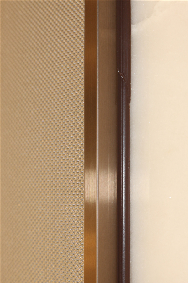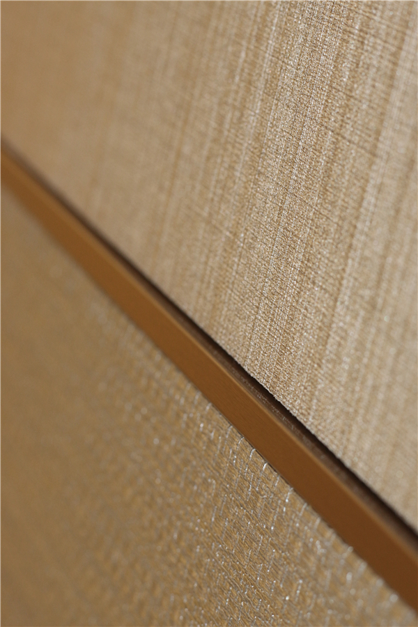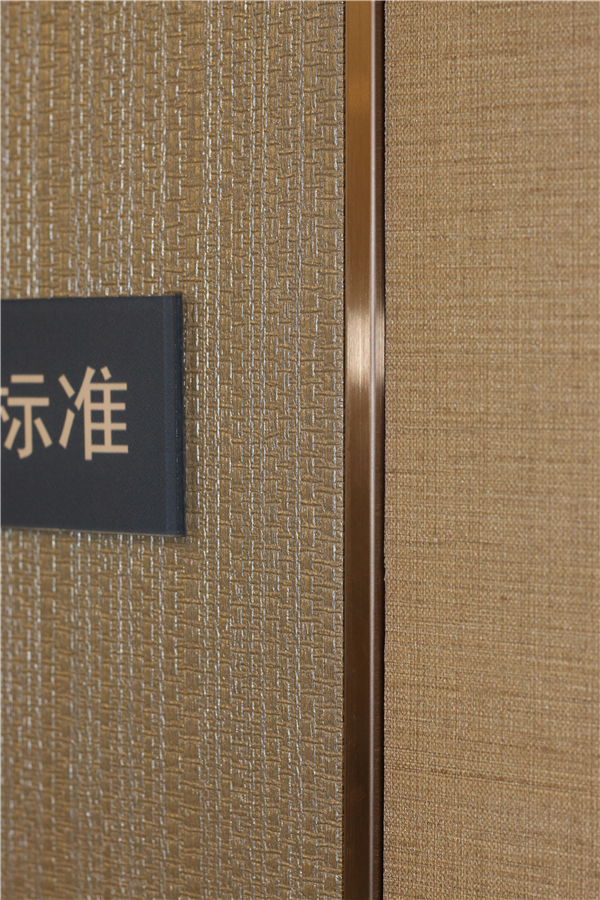 墻面在麻質(zhì)面料上用同樣筆直的金屬條勾勒精致與氣派,且必須先粘好墻布再扣上金屬條保證美觀(guān),即使是鮮有低頭細看的金屬踢腳線(xiàn)也同樣不可蒙混過(guò)關(guān),每一個(gè)收口處都必須重視。