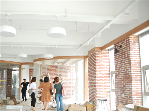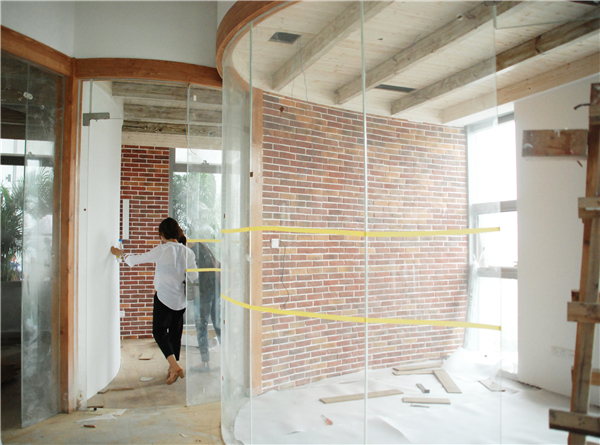 踏入工地,紅磚、實(shí)木、白漆,如cafe般休閑愜意的辦公室已初具雛形。