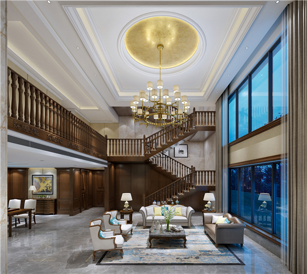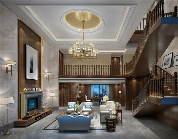淺色系大理石讓空間在視覺(jué)上得以最大限度延伸,搭配挑高的客廳與落地窗,明亮開(kāi)闊的空間就此呈現。設計師特別選用淺灰色紋理大而不繁的天然大理石,白色、銀灰與深色實(shí)木結合的美式家具,些許淡雅色彩點(diǎn)綴其中,即使是樓梯欄桿及墻面大面積采用深色實(shí)木打造亦不顯凝重,整個(gè)空間古典而不古板。