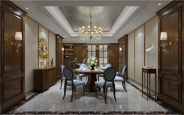 餐廳墻面在古典造型的實(shí)木中局部采取米色系墻布加金屬邊框,厚重中透露一絲緩和,作為餐廳主要構成的灰藍餐椅也給經(jīng)典帶來(lái)了時(shí)尚感。