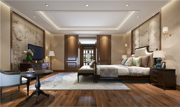 臥室減去了硬朗的金屬條框與大理石,床頭背景墻與電視背景墻是古樸雅致的花鳥(niǎo)圖刺繡,在這個(gè)美式空間中絲毫不顯突兀,中西合璧,反覺(jué)自然融洽,也許這就是經(jīng)典的奇妙吧。