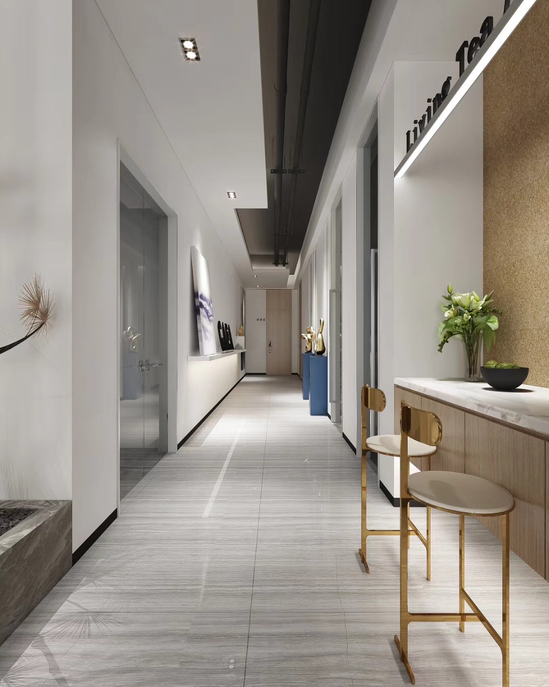 ▼前廳:運用簡(jiǎn)潔的造型和光感材料,和大面積的白與灰的結合使空間醒目,利用燈光來(lái)調和豐富這一空間的層次感,也表現出企業(yè)現代科技高端大氣的氣質(zhì)。