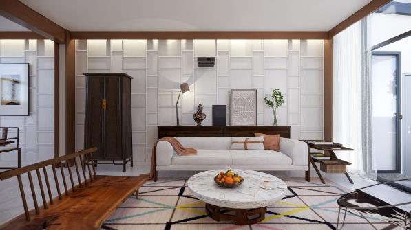 一把老木長(cháng)椅,一件中式邊柜,搭配造型時(shí)尚的北歐家具,點(diǎn)綴綠翠幾支和趣玩擺件,腳下的彩紋地毯肆意地蔓延開(kāi),營(yíng)造一種無(wú)拘無(wú)束的生活狀態(tài)。