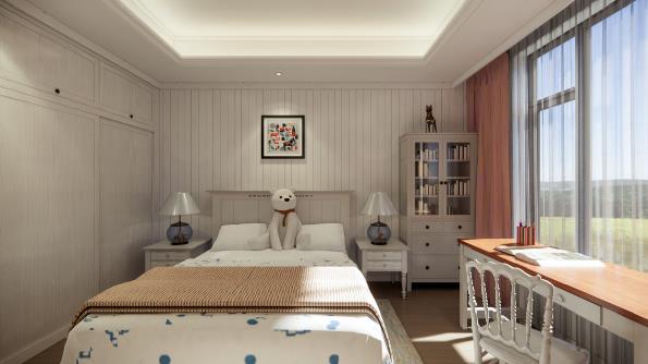 兒童房以淺色為主,背景墻和衣柜統一為白色條紋,結合美式家具,給孩子一個(gè)浪漫而溫馨的睡眠環(huán)境。