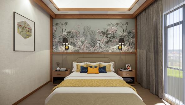 長(cháng)輩房從色調到裝飾頗具古典氣息,營(yíng)造出一個(gè)郁郁蔥蔥的自然之境。床頭的軟包設計,帶給空間更多的質(zhì)感。